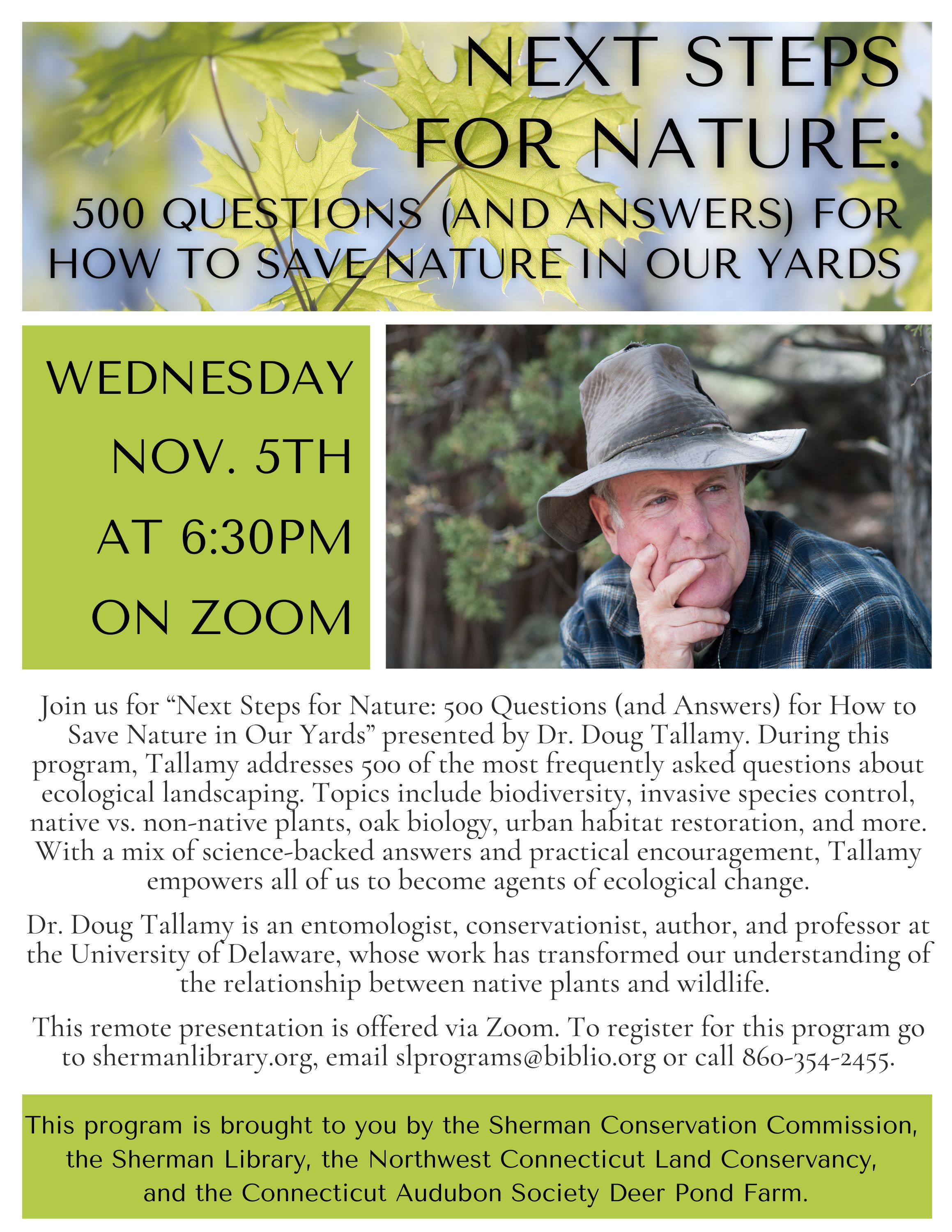 Join renowned ecologist and bestselling author for a new presentation, "Next Steps for Nature: 500 Questions (& Answers) for How to Save Nature in Our Yards." Based on the most frequently asked questions from readers and audiences, this discussion dives deeper into practical, effective ways we can support biodiversity at home. Hosted virtually via Zoom by the Sherman Library. (Co-sponsored by the Sherman Conservation Commission, Northwest CT Land Conservancy, and CT Audubon’s Deer Pond Farm).