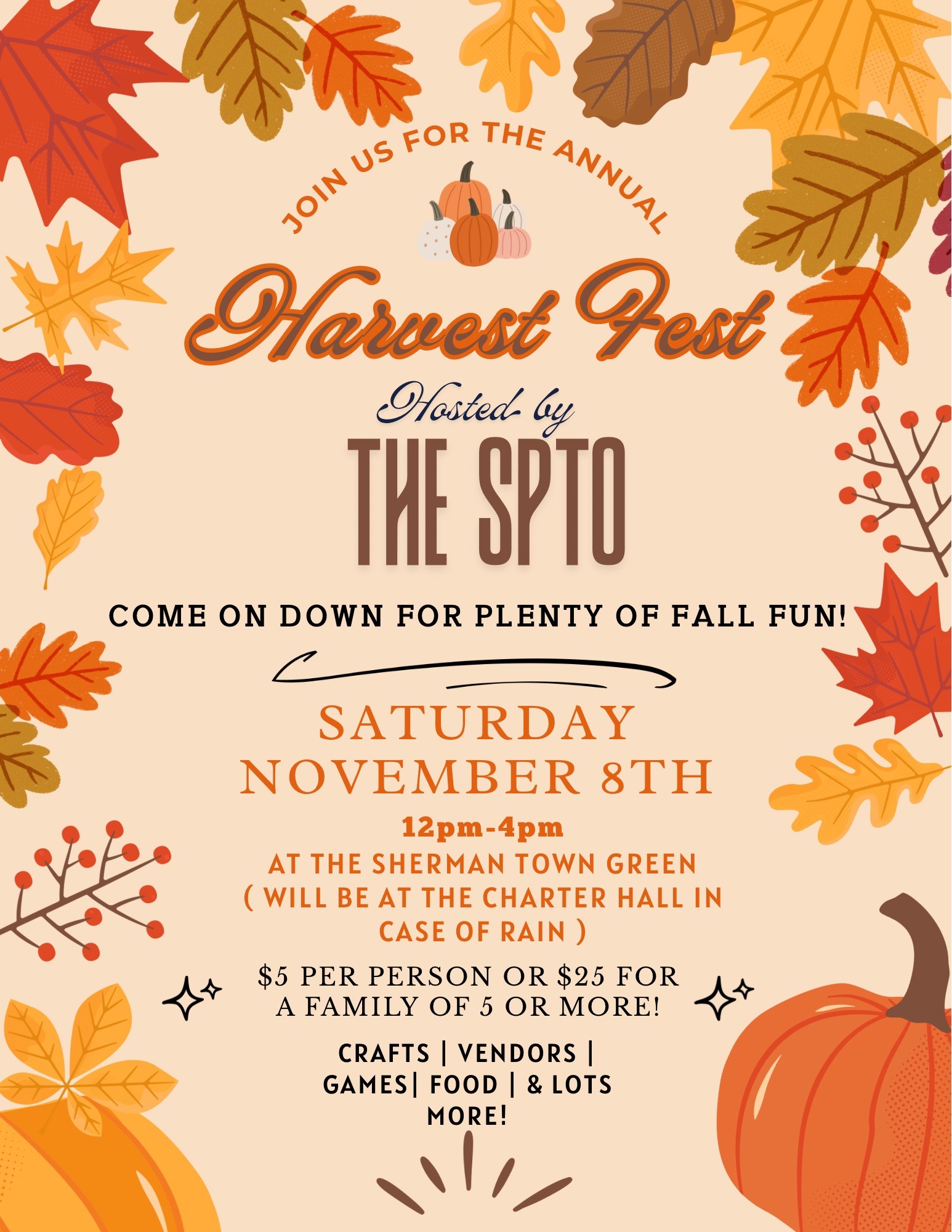 It’s that Time of Year again! Please join the Sherman community, as well as the SPTO for our Annual Sherman Harvest Fair! This year, there will be surprises Sherman has never seen before! So don’t miss out on any of the November fun.