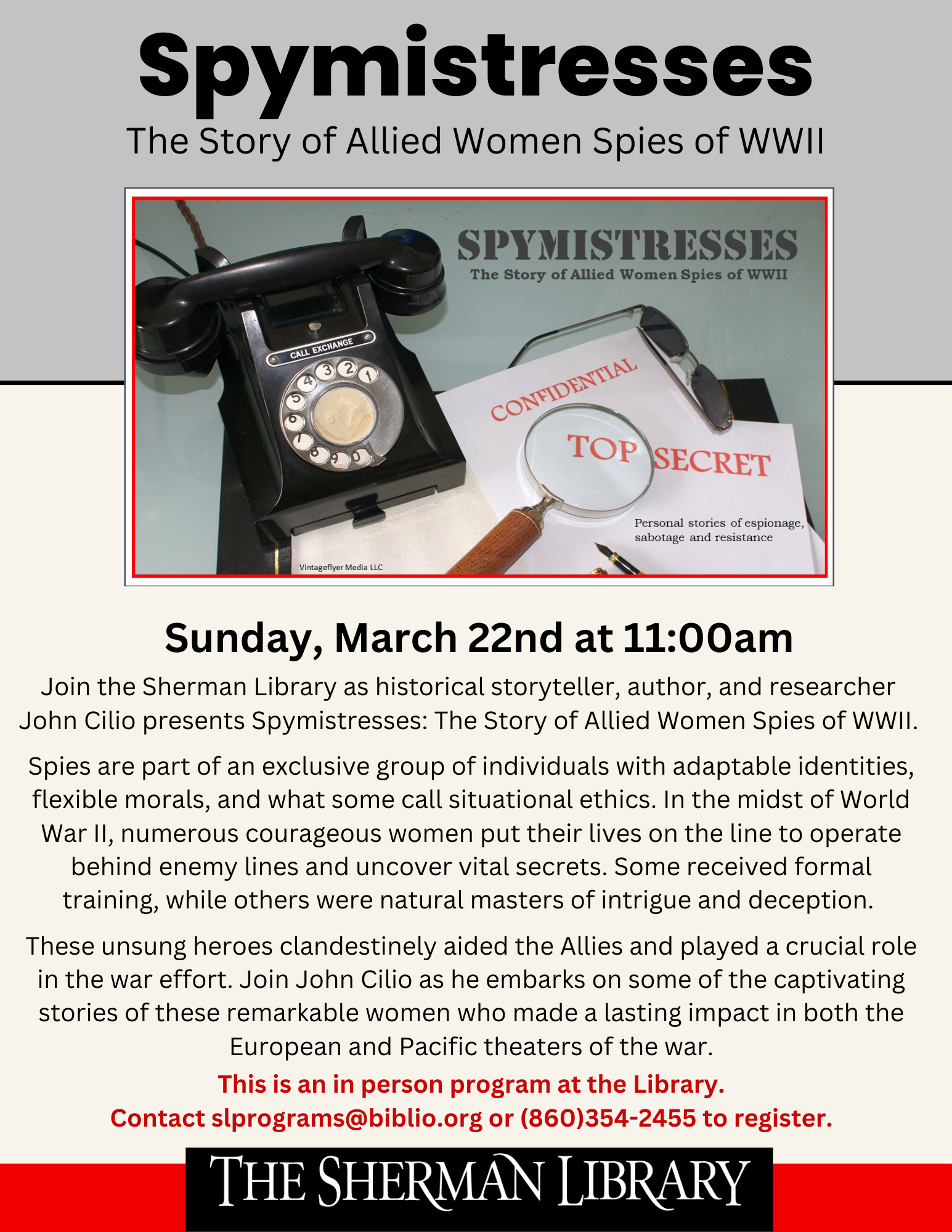 Join the Sherman Library for Spymistresses- The Story of Allied Women Spies of WWII, an illustrated talk on March 22nd at 11:00am with John Cilio, author, historian and lecturer.