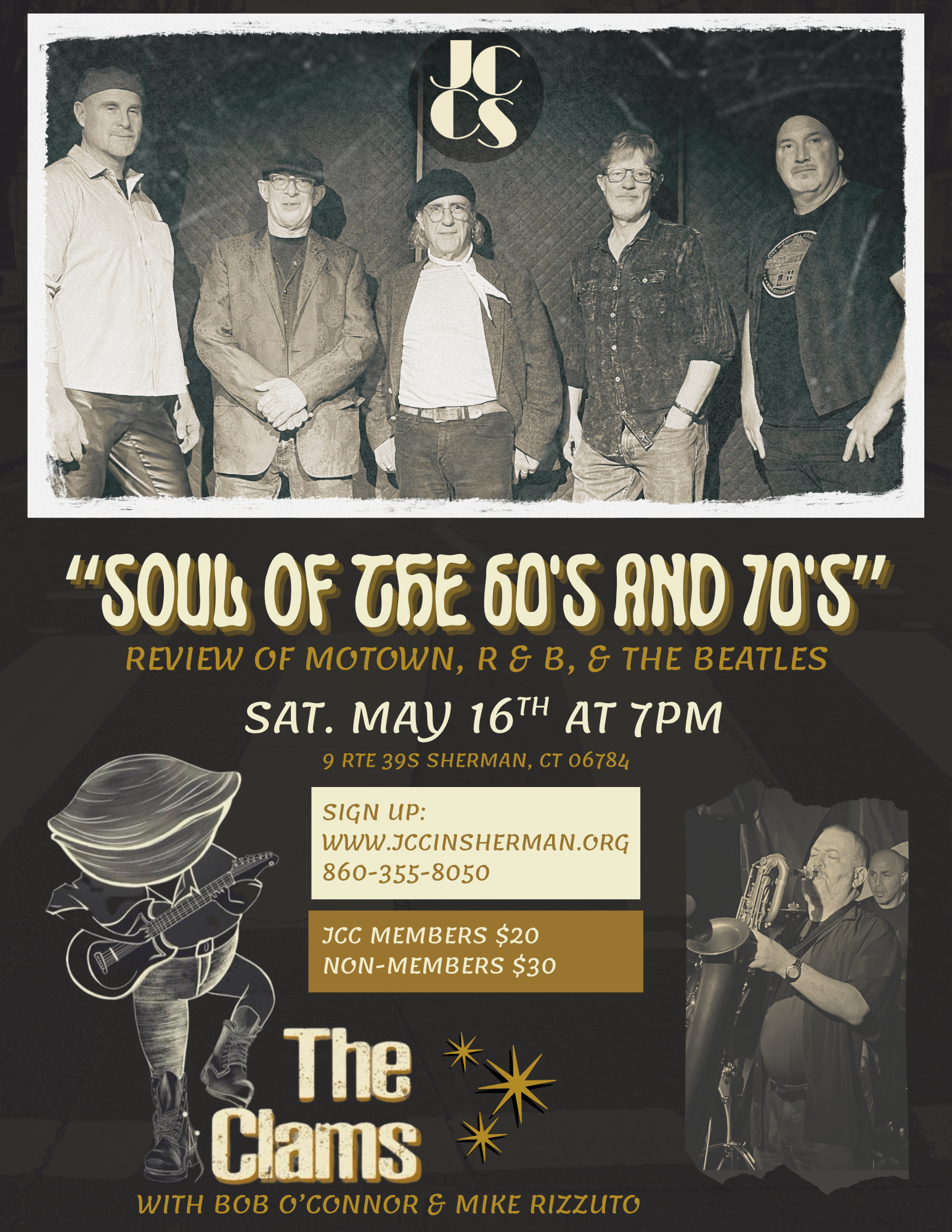The Clams will be re visiting the "Soul of the 60's and 70's" celebrating the best of Motown and classic R & B. And yes, the Beatles, "Abbey Road Medley".With special guests: Bobbi O'Connor and local legend Mike Rizzuto on Bari Saxophone!