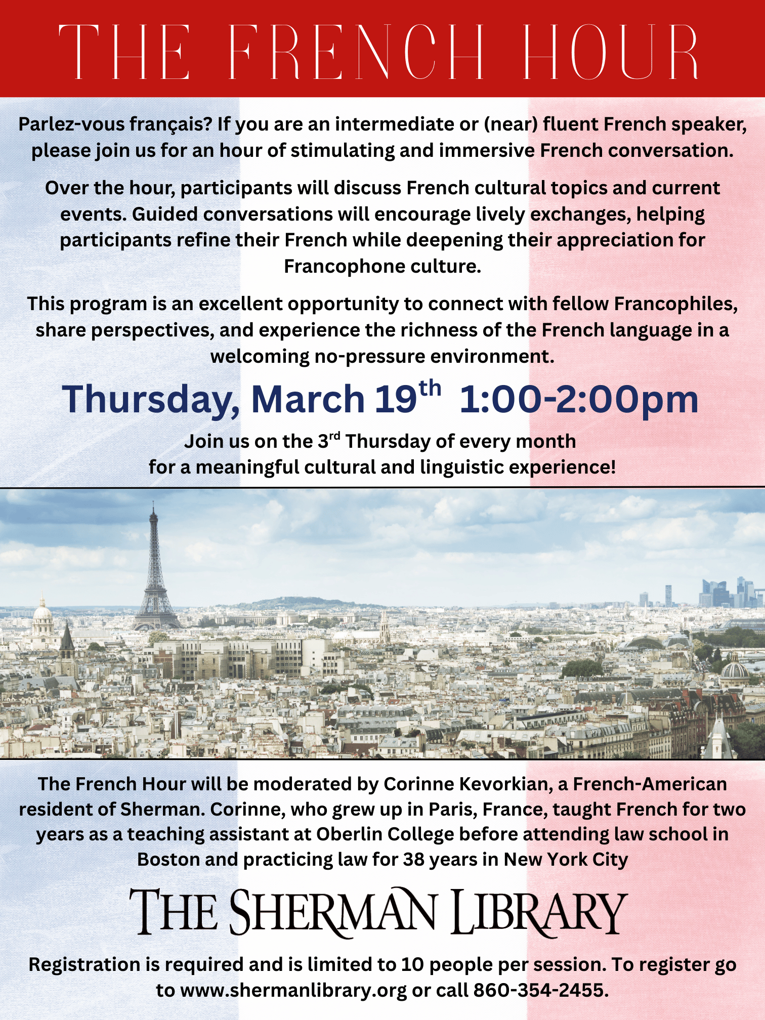 Parlez-vous franÇais? Join us on the 3rd Thursday of every month for a meaningful cultural and linguistic experience! If you are an intermediate of (near) fluent French speaker, please join us for an hour of stimulating and immersive French conversation at the Sherman Library on Thursday, March 19th 1-2:00pm.