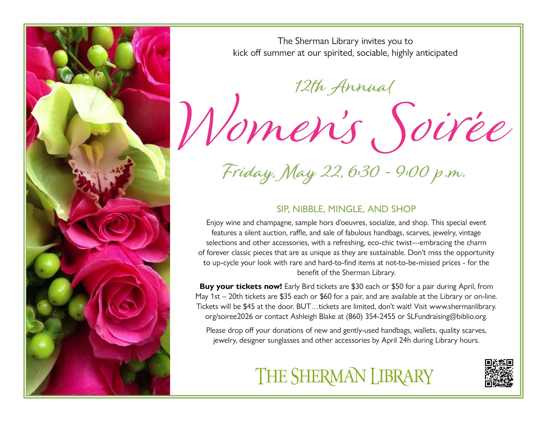 Buy your tickets now! Early Bird tickets are $30 each or $50 for a pair in April. From May 1st – 20th tickets are $35 each or $60 for a pair. Tickets at the door are $45 each unless sold out. BUT…tickets are limited, don’t wait! Visit www.shermanlibrary.org/soiree2026 or contact Ashleigh Blake at (860) 354-2455 or SLFundraising@biblio.org. Library hours are Tuesday 11-6, Wednesday 11-6, Thursday 11-7, Friday 11-6, Saturday 10-4.