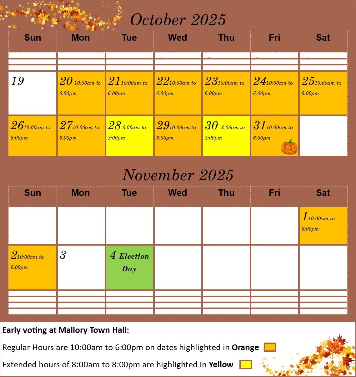Early voting will be held at Mallory Town Hall on the following dates and times: